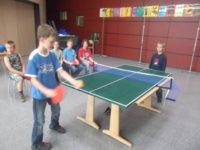 In der ersten Woche der Ferienspiele gab es zwei Workshops, zwischen denen die Kinder wählen konnten: Der Bau einer Tischtennisplatte und töpfern. Um die Platte zu bauen, haben wir den Umgang mit vielen Werkzeugen gelernt und die Kinder haben alles selbst gemacht: Holzplatten abgeschliffen, Kanten rund geschmirgelt, die Platten mit Farbrollen grundiert und mit Pinseln die Feinheiten ausgearbeitet. Für die Netze mussten wir Löcher bohren, Rundhölzer zusägen, feilen und einkerben und ein Netz aus Schnur knüpfen. Nach dem erfolgreichen Fertigstellen der Platten haben unsere Tischtennisprofis sie beim großen Turnier in der Aula standesgemäß eingeweiht und konnten sensationelle Preise gewinnen. Die Platten wurden auch in den folgenden Wochen der Ferienspiele viel bespielt und werden auch im kommenden Schuljahr die Ausstattung der OGS aufwerten.