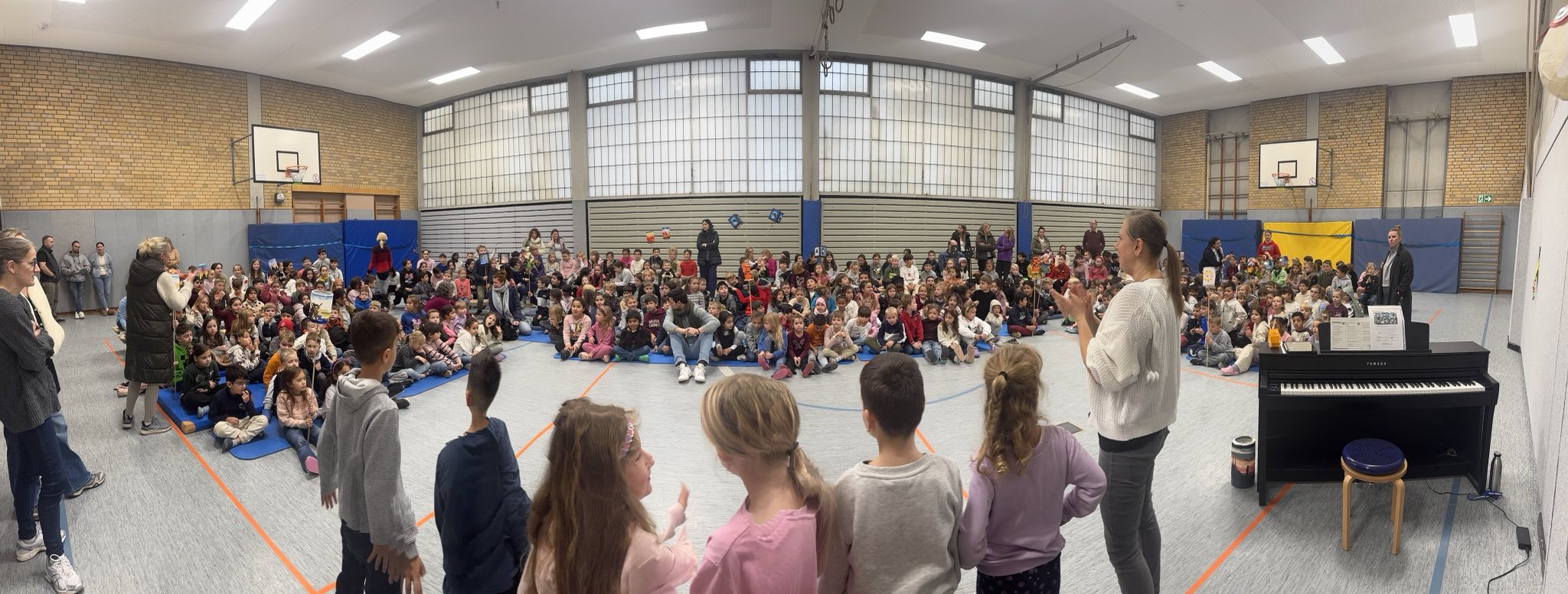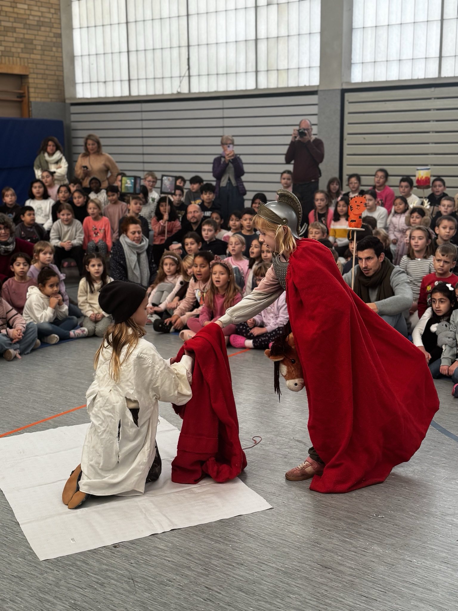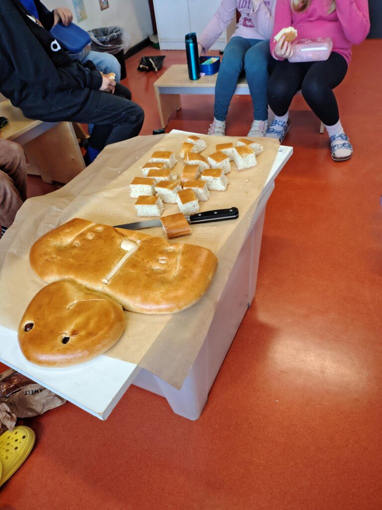 Unser diesjähriger Martinstag fand am 12.11.25 statt. Am Vormittag trafen sich alle Kinder zum gemeinsamen Martinssingen in der Turnhalle. Jede Klasse stellte ihre Laterne vor und es gab ein kleines Martinsspiel. Anschließend wurde in allen Klassen ein großer Weckmann zum Frühstück geteilt, so wie Sankt Martin auch damals teilte.