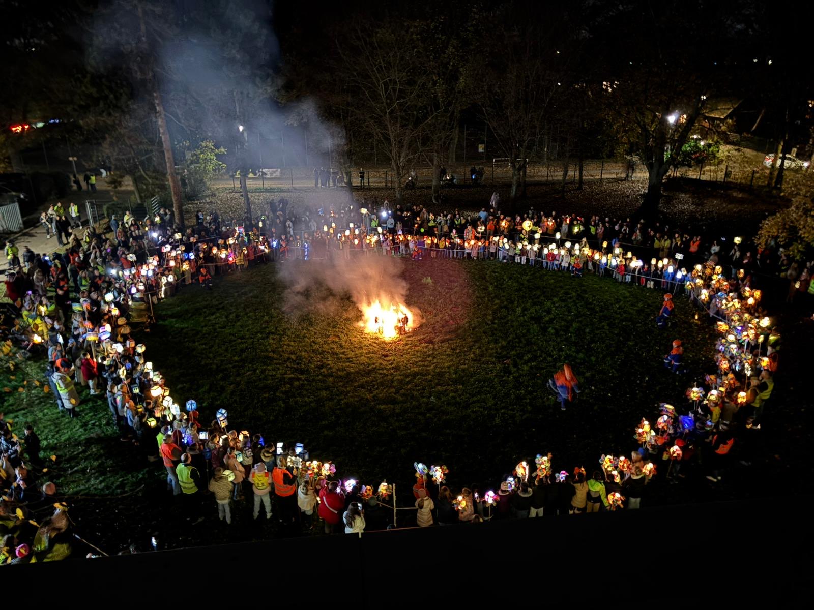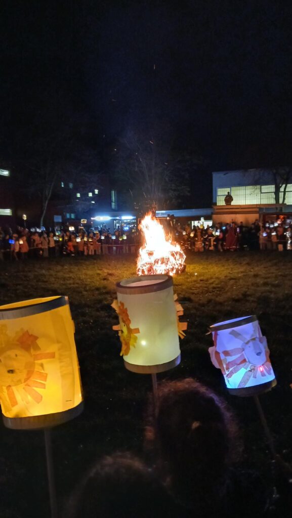 Am Abend folgte der Martinszug mit vielen wunderschönen und leuchtenden Laternen. Die Kinder der Heideschule zogen durch die Straßen und wurden musikalisch von zwei Kapellen unterstützt. Vorneweg ritt Sankt Martin auf seinem Pferd. Am Ende des Zuges fand das große Martinsfeuer auf unserer Schulwiese statt. Verköstigt wurden die Eltern und Familien durch den Förderverein, der das Forum und den Schulhof wunderschön und stimmungsvoll dekoriert hatte.